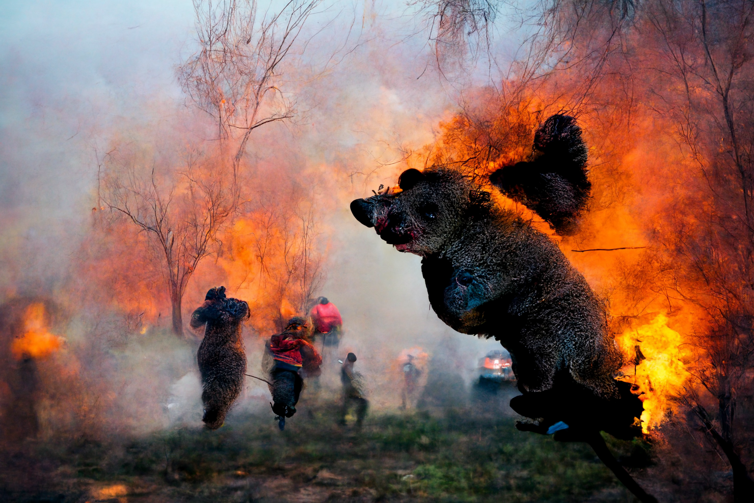 The first photo shows a koala bear fleeing from a raging bushfire. The animal is engulfed in flames, and its fur is singed.